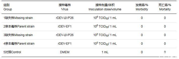 各组免疫后观察2周,发现各剂量的rDEV-ΔVP26组、rDEV-EF1组和DMEM对照组鸭子精神状态良好,均未出现死亡(表2)。