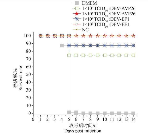 分别用两种剂量(1×104 TCID50和1×105 TCID50)的rDEV-ΔVP26和对照毒株rDEV-EF1免疫鸭后14 d,用DEV强毒株对免疫鸭进行攻毒,统计鸭的存活率。
