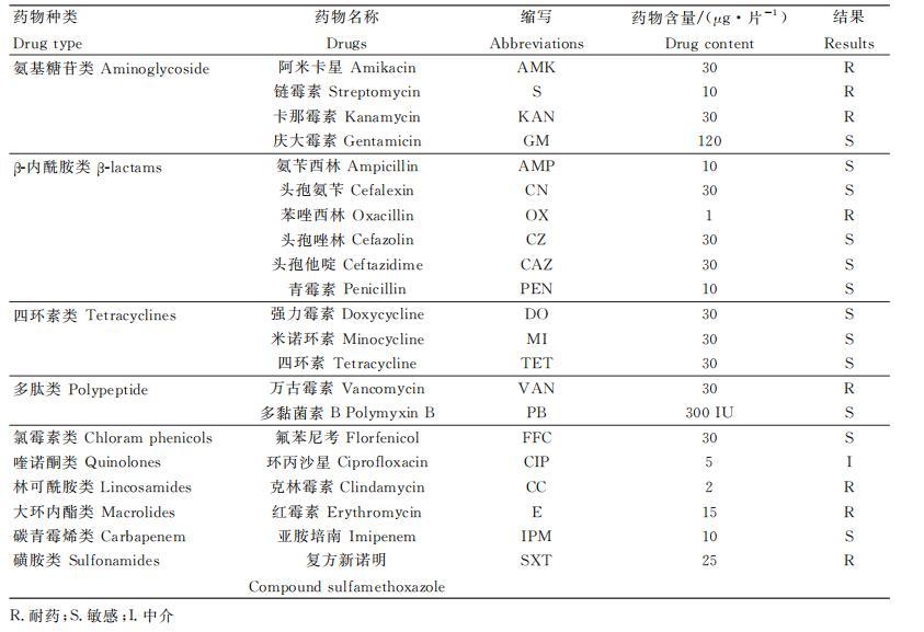 药敏试验结果如表2所示,该菌株对阿米卡星、多黏菌素 B、链霉素、卡那霉素、克林霉素、复方新诺明多重耐药,对氨基糖苷类药物耐药最为明显,对β-内酰胺类药物最为敏感。