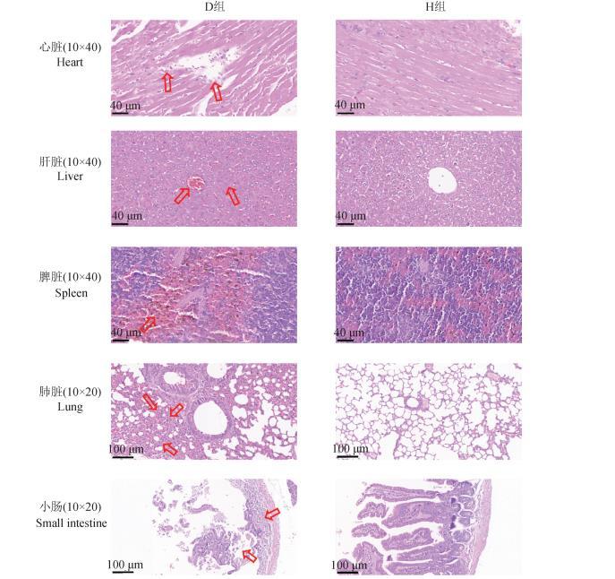 组织病理切片观察见图5,与对照组小鼠对比,试验组病死小鼠心肌纤维断裂、心肌充血;肝小叶中央静脉充血,肝窦充血,肝细胞部分索状结构消失;脾脏红髓几乎全由红细胞充满;肺泡上皮细胞增生,组织间隙出血,大量炎性细胞渗出;小肠部分黏膜上皮断裂脱落进肠腔,D2、D3、D4组部分肠绒毛结构消失,固有层裸露,有炎性细胞浸润,充血,D5组几乎没有完整肠绒毛。
