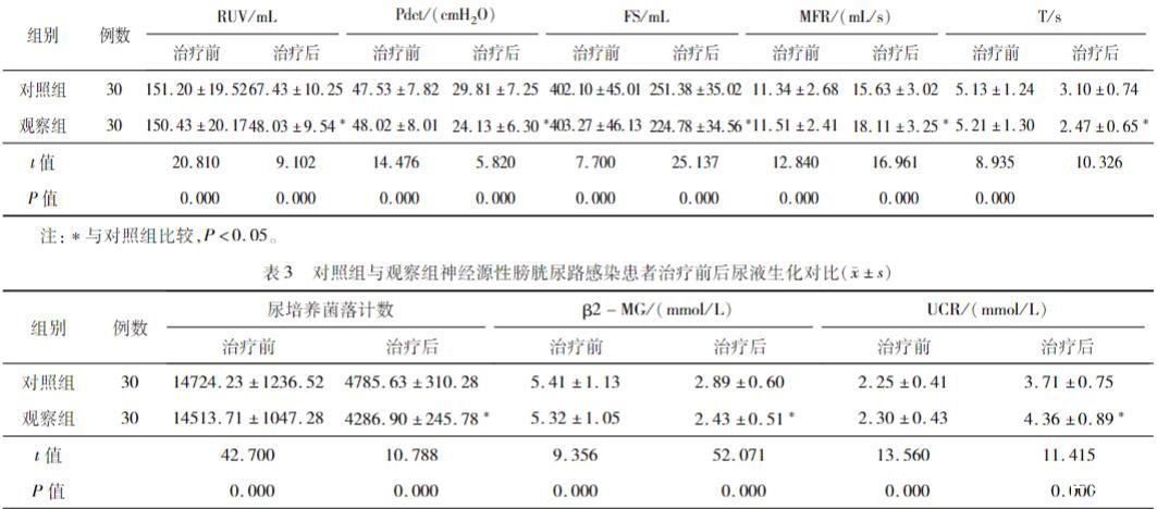 表2对照组与观察组神经源性膀胱尿路感染患者治疗前后尿流动力学对比(x±s)