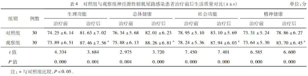 表4对照组与观察组神经源性膀胱尿路感染患者治疗前后生活质量对比(珋x±s)单位:分