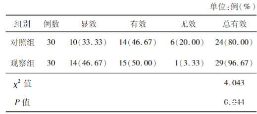 表1可见。对照组总有效率(80.00%),低于观察组(96.67%),差异有统计学意义(P<0.05)。