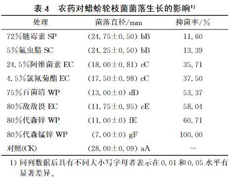 表4农药对蜡蚧蚧轮枝菌菌落生长的影响