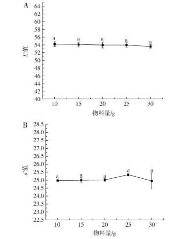 由图6可知,沙棘果粉的L*值、a*值、?b*值随着物料量的增加均无显著性变化(Pgt;0.05),说明10~30g物料量对沙棘果粉的色差没有明显影响。在相同微波能量和微波时间下,随着物料量的增加,微波效能对沙棘果粉色差的作用不显著。当物料量为10,15,20,25,30g时,ΔE分别为0.11,0.98,1.03,0.7,0.85。