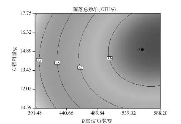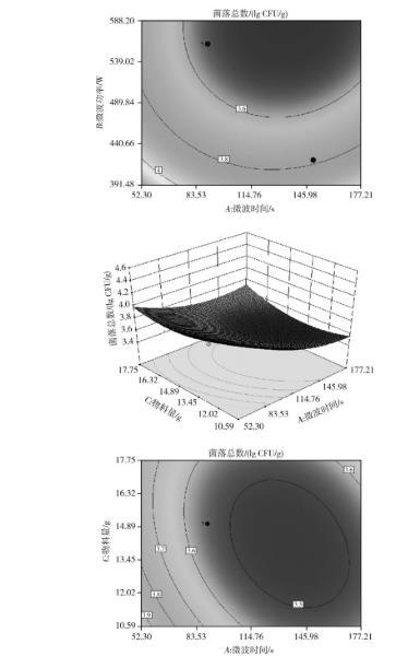 由表3可知,模型的一次项B、交互项AC的影响显著(Plt;0.05);一次项c、交互项AB,BC的影响不显著(Pgt;0.05);一次项A、二次项A2,B2,C2的影响极显著(Plt;0.01。根据F值的大小判断各因素对菌落总数的影响大小为微波时间gt;微波功率gt;物料量。