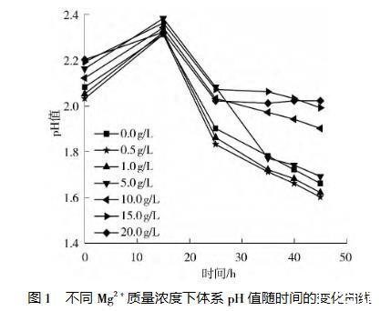 从图2可以发现:体系的Eh值随培养时间的延长呈先逐渐升高后趋于稳定的趋势。在细菌生长过程中,Fe2?的氧化为细菌生长提供所需能量,使得溶液中Fe3?浓度增加,溶液的混合电位逐渐升高;当Fe2?氧化完全时,氧化还原电位达到最高值,且维持在相对稳定的范围内。Mg2?对体系Eh值影响较大,当Mg2?质量浓度≥5.0 g/L时,体系中电位上升较慢,Mg2?质量浓度超过10.0 g/L时体系的Eh值在整个45 h的培养过程中都处于较低水平,最高仅可达440 mV左右;而当Mg2?质量浓度<5.0 g/L时,体系的Eh值在35 h左右均已达到600 mV以上,说明小于5.0 g/L的Mg2?质量浓度对At.f菌氧化活性没有负面影响。