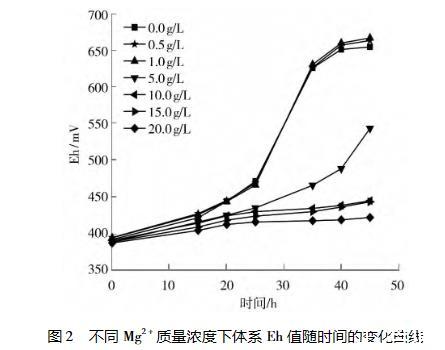 氧化还原电位能从整体上反映系统的氧化能力。不同质量浓度Mg2?下At.f菌培养过程中Eh值随时间的变化情况如图2所示。