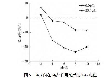 At.f菌在Mg2?质量浓度为0.0、20.0 g/L体系中培养后,其表面电位随pH值的变化曲线如图5所示。