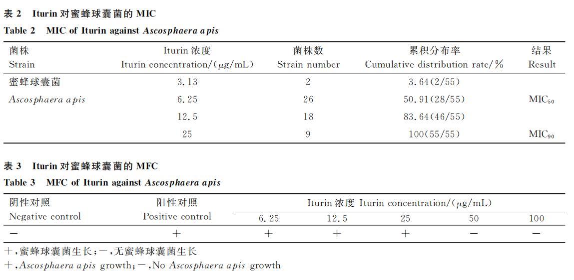 由图4可知,Iturin浓度为0.2~3.13μg/mL时,蜜蜂球囊菌D???nm值较高;Iturin浓度为3.13~25μg/mL时,D???nm值持续变低;当Iturin浓度>25μg/mL时,达到最大抑菌效果。累积分布率统计表明,Iturin浓度为3.13μg/mL时,可抑制2株菌株(累积分布率2/55);浓度升至6.25μg/mL时,抑菌范围扩大至26株,使累积抑菌株数达28株(累积分布率28/55),确定Iturin对蜜蜂球囊菌的MIC??值为6.25μg/mL。Iturin浓度为25μg/mL时,所有受试菌株均被抑制(累积分布率55/55),确定Iturin对蜜蜂球囊菌的MIC??值为25μg/mL(表2)。