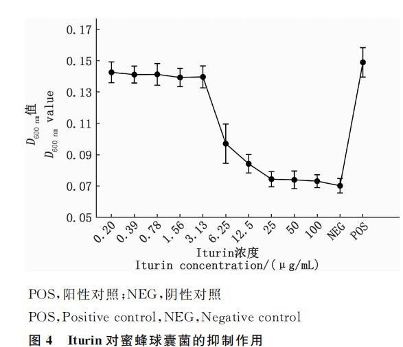 本研究从患白垩垩病蜜蜂幼虫中成功分离纯化蜜蜂球囊菌,脂肽Fengycin和Iturin可抑制蜜蜂球囊菌菌丝生长,Iturin作用效果最好,Surfactin无抑制作用。Iturin在48h对蜜蜂球囊菌的MIC??、MIC??和MFC分别为6.25、25和50μg/mL。Iturin可有效抑制菌丝生长、蜜蜂球囊菌孢子萌发,并破坏细胞膜和细胞壁。