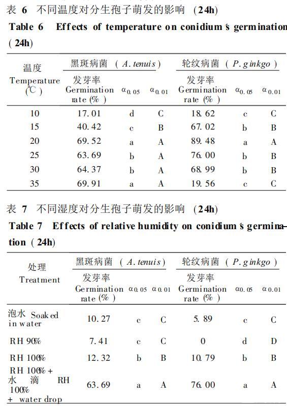 朱克恭研究认为银杏叶枯病的病原菌中,黑斑病菌在6月~10月都有大量的出现,而轮纹病在高温季节很少出现,仅在10月份才有所增加。本实验得到相似的结果,轮纹病菌不能耐35℃的高温,黑斑病菌耐高温的能力强。2种菌在RH65%以上都生长好,适宜的相对湿度为75%~85%,试验结果表明:相对湿度大有利于分生孢子形成;饱和湿度且有水滴的培养条件,分生孢子的发芽率最高。因此,在综合防治中,清除银杏果园内的杂草,降低地表面的相对湿度,可以在一定程度上减少侵染来源。泡水处理中,分生孢子的发芽率低,也许与缺氧有关。