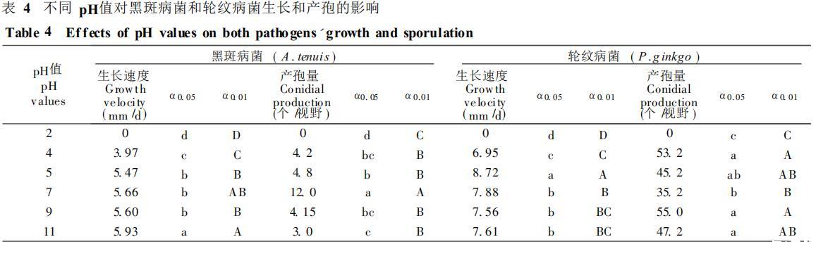 试验结果(表4)表明,2种菌在pH值<2都不能生长,生长和产孢pH值范围为4~11,并且以pH值5~11基质中生长为好。黑斑病菌在pH值为11的基质中生长快,但此时菌落稀疏,产孢量较少;pH值为7时,该菌生长速度仅次于pH值11,且菌丝浓密,产孢量最大;在pH值4~5和pH值9~11范围内的产孢量没有达到极显著水平。轮纹病菌在pH值4~9基质中形成同心环型菌落,其中以pH值为5的基质上生长最好,气生菌丝发达,菌落浓密,pH值为4和pH值为9的产孢量最大,两处理间的产孢量没有显著性差异。