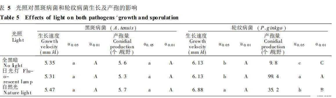 从表5可知,光照对黑斑病菌的生长、产孢,以及对轮纹病菌的生长都没有显著的影响。对于轮纹病菌,日光灯照射4d后开始形成分生孢子,自然光照射6d后形成少许分生孢子,全黑暗条件下8d开始形成分生孢子。由此可见,光照能促进轮纹病菌分生孢子的形成,且日光灯照射比自然光照射,产孢量多1倍以上。