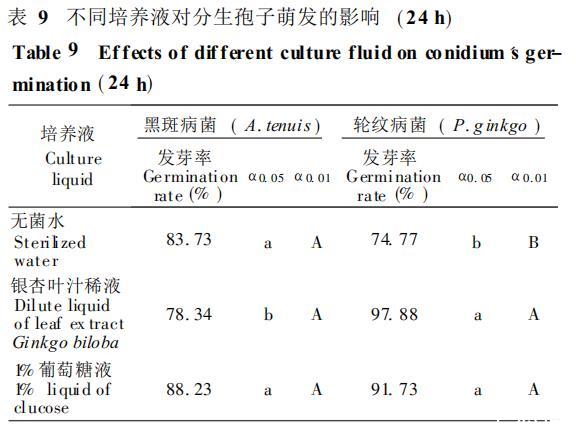 从表9可看出,黑斑病菌的分生孢子24h的发芽率在α?.??水平上没有显著性差异,说明该菌分生孢子萌发与培养液有无养分没有显著关系。而轮纹病菌的分生孢子在银杏叶汁稀液和1%葡萄糖液中的萌发率高,且不存在显著性差异;但与在无菌水中萌发比较就存在显著性差异。