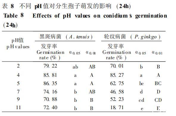 从表8可看出,2种菌的分生孢子在pH值2~11都能萌发。黑斑病菌的分生孢子萌发适宜pH值为2~7,最适pH值为4~5;轮纹病菌的孢子在pH值2~5范围萌发较好,最适为pH值4。由此可见,偏酸性的环境有利于黑斑病菌和轮纹病菌的分生孢子萌发,尤其是后者。