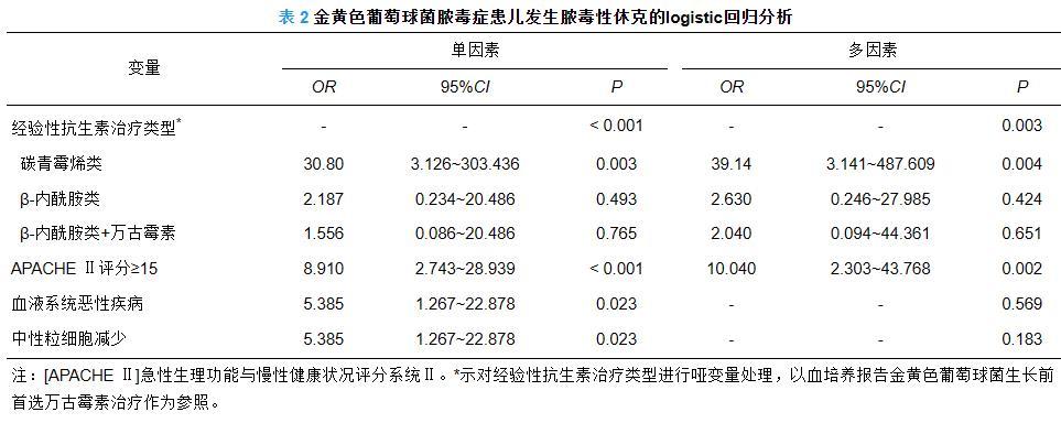 表2金黄色葡萄球菌脓毒症患儿发生脓毒性休克的logistic回归分析