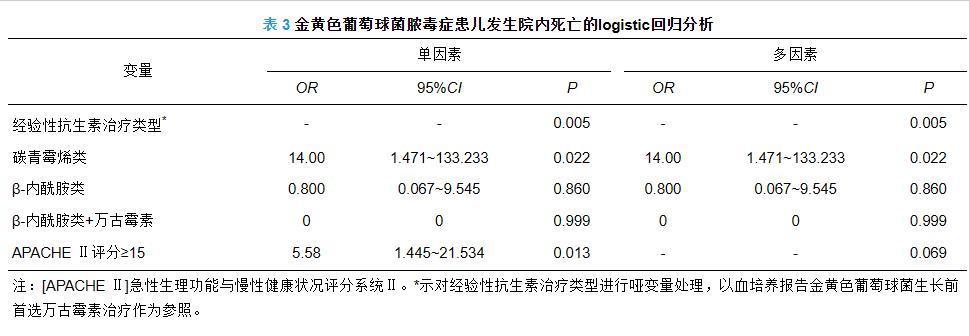表3金黄色葡萄球菌脓毒症患儿发生院内死亡的logistic回归分析