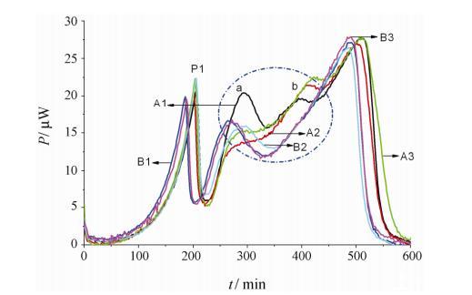 图3中A1、A2和A3为BZY清开灵注射液生长曲线图,B1、B2和B3为SXTH清开灵注射液生长曲线图。由图可见,BZY、SXTH两个厂家的样品对于金葡菌生长曲线的影响有较大差异,BZY样品的稳定期较SXTH样品多一个峰,如图所示峰b,且P1也较SXTH样品大。