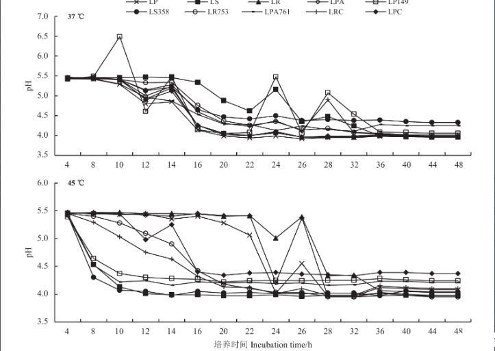 在37和45℃下,所有菌株的pH均从5.5开始总体呈下降的趋势,在4.3左右达到稳定(图4)。37℃时,LP149的pH波动较大;LS358和LR753在14 h时产酸速率最大,在20 h左右进入稳定期;LPA761在10 h时pH下降最快,在20 h时进入稳定时期。