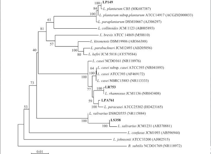 与标准菌株相比,LP149不能利用菊粉、山梨醇、D-甘露醇、水杨苷和半固体琼脂,对苦杏仁苷的利用较弱,能较好利用鼠李糖、木糖以及马尿酸(表3);而LS358对菊粉、阿拉伯糖、马尿酸的利用能力较强,对水杨苷的利用较弱,不能利用山梨醇、D-甘露醇、鼠李糖、七叶苷和半固体琼脂;LR753对蜜二糖和木糖的利用能力良好,但相对于标准菌株,对菊粉的利用能力下降,对鼠李糖的利用能力有所提;LPA761不能利用菊粉和苦杏仁苷,对鼠李糖利用能力较强,对棉子糖和乳糖的利用能力减弱。系统发育树结果表明,LP149、LS358、LR753及LPA761与L.plantarum、L.salivarius、L.rhamnosus和L.paracasei标准菌序列相似度均为100%(图2)。