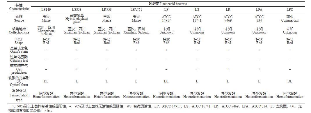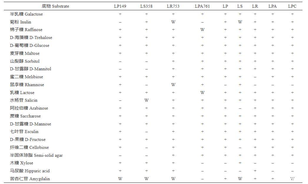 测定了筛选到的4株乳酸菌和4株标准菌及1株商用植物乳杆菌LPC的生理生化特性(表2)。分离菌株均为革兰氏阳性和过氧化氢酶阴性,均呈杆状。LP149和LPC均无法消耗葡萄糖产生气体,可以产生DL-乳酸,表明它们是同型发酵乳酸菌,其余3株菌为异型发酵乳酸菌。