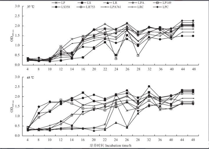 在45℃时,与标准菌株相比(图3),4株自选菌株的生长情况均更加良好。LP149在12 h时OD值达到最大,从16 h开始进入稳定时期;LS358在8 h时生长速率最大,从10 h开始OD值较稳定上升;LR753在12 h时生长最快,从16 h开始进入较稳定的时期;LPA761在8 h时生长速率达到最大,从10 h开始进入稳定期。
