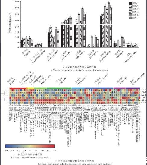 各处理组不同种类挥发性化合物含量比较分析结果见图7a。试验中检测到的品种香气化合物有萜烯、C13-降异戊二烯以及C6化合物。其中HX-2处理酒样萜烯含量(92.15μg/L)显著高于其他处理(P<0.05)。结合挥发性化合物聚类热图(图7b)发现,HX-2处理酒样柠檬烯、香茅醇以及橙花醇相对含量显著高于其他菌株(P<0.05),是导致该酒样萜烯类化合物含量较高的原因。HX-1、HX-2、HX-3、HX-4发酵酒样中均能检测到β-大马士酮,尤其是HX-2处理组的β-大马士酮含量最高(30.14μg/L),而HX-6、HX-7处理中未检测到该化合物。HX-3菌株发酵显著提高了C6化合物含量(P<0.05)(图7a),特别是1-己醇的相对含量显著高于其他菌株处理(P<0.05)(图7b),可能赋予葡萄酒特定的生青味。