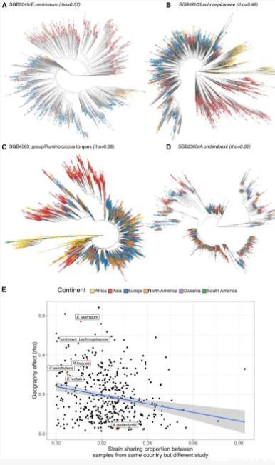 (A-D)基于地理多样性和样本量选择的代表性SGB系统发育树,标注了样本采集的大陆信息。为便于可视化,由于荷兰样本对应的分支数量过多,已从系统发育树中排除。
