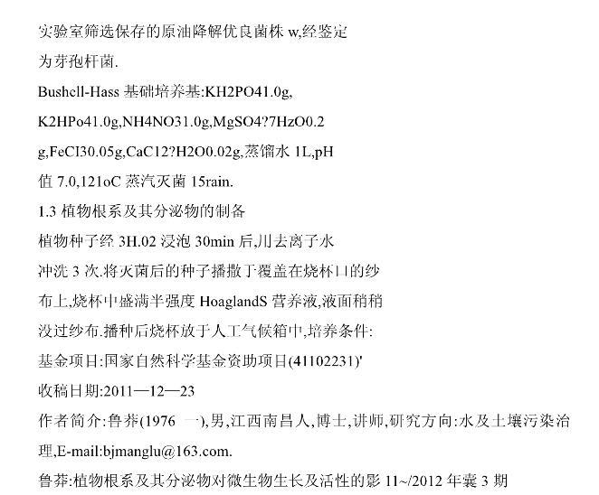 【摘要】:通过无土培养获得植物(黑麦草、高羊茅及紫花苜蓿)的根系及其分泌物,以摇瓶培养的方式考察了其对微生物生长及活性的影响。结果表明,黑麦草、高羊茅及紫花苜蓿的根系及其分泌物能支持微生物的生长,并促进原油的降解;黑麦草与高羊茅处理间的差异不显著,但这两种草本植物与紫花苜蓿处理间有显著差异;根系对微生物生长和原油降解的刺激效应持续时间比根系分泌物的刺激效应持续时间要长。