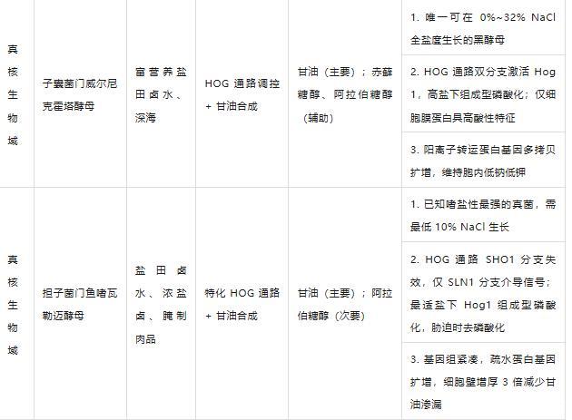 鱼嗜瓦勒迈酵母:是已知嗜盐性最强的真菌,生长需最低10%NaCl,最适15%~20%NaCl,32%NaCl下仍可代谢;无有性态及可识别交配型位点。仅分离到24株,均来源于盐田卤水、浓盐卤、腌制肉品等高盐环境。