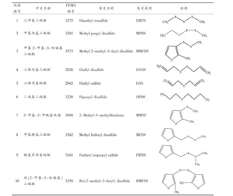 本研究根据GB 2760-2014《食品安全国家标准食品添加剂使用标准》选取了10种硫醚类香料,均从美国Sigma公司订购。名称及结构见表1。