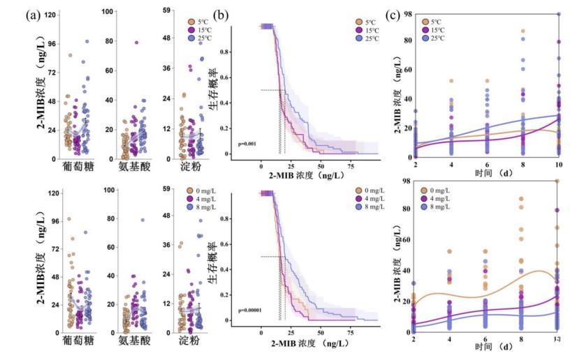 图3为不同温度和溶解氧对链霉菌所产生嗅味的影响结果图:(a)为不同温度(5℃/15℃/25℃)和溶解氧(0mg/L/4mg/L/8mg/L)对2-MIB产量的差异趋势图;(b)为不同温度和溶解氧条件下嗅味事件发生的生存概率图;(c)为不同温度和溶解氧随时间变化的分组拟合曲线散点图。