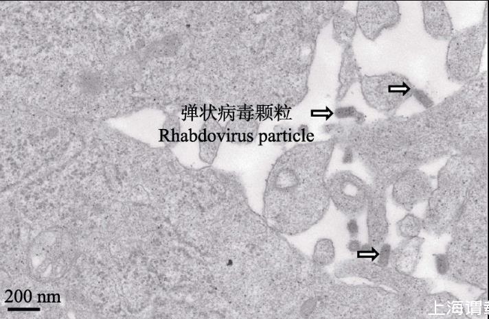 将SVCV接种GCO细胞后,电镜观察可见,在GCO细胞质内有典型弹状病毒颗粒(约为140 nm,图8)。