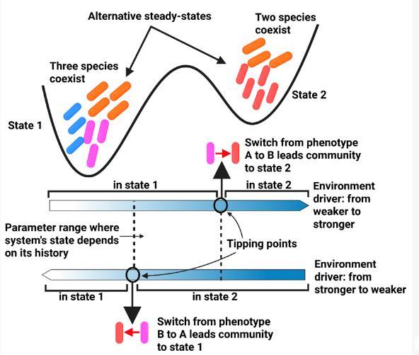 生态学经典理论指出,由于物种间的相互作用(如互利共生或竞争)以及与环境的反馈调节,生态系统可能存在多个稳定状态。例如,湖泊可能突然从清澈状态转变为富营养化状态,这种“政权更迭”现象在自然界中屡见不鲜。然而,在微生物生态系统中,直接观测稳态切换并解析其底层机制极具挑战。过去的研究多依赖于对自然样本的观测分析,难以剥离复杂环境变量的干扰,从而无法从动力学角度给出严格的机制解释。