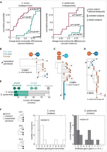 总体而言,这些结果表明谱系共享更可能发生在密切接触的人群之间。值得注意的是,尽管存在因接触而可能发生的传播,家庭成员仍保留了彼此独特的微生物群落。同一受试者在不同时间点采集的样本之间相似性明显高于来自同一家族中其他成员的样本。此外,大多数父母所携带的谱系并未在配偶之间共享(痤疮丙酸杆菌:37个谱系中有23个未共享;表皮葡萄球菌:28个谱系中有23个未共享,详见STAR方法)。