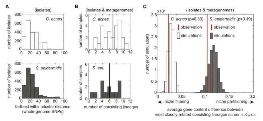 如果谱系因功能差异而共存,理论上应出现“过度离散”(overdispersion)现象——即同一宿主体内的谱系间差异大于随机抽样所得的期望差异。但无论是在基因组内容还是系统发育距离方面,我们在这两种菌中均未观察到过度离散现象(图2C),这表明亲缘关系密切的谱系也可以共存。尽管这些结果无法完全排除存在低于检测限的生态位分化或生态位过滤,但它们支持一个中性模型:痤疮丙酸杆菌和表皮葡萄球菌的亲缘谱系可在面部皮肤上共存,且共存并不必然依赖于功能差异。