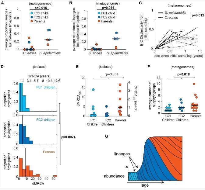 综上,我们通过宏基因组的纵向数据和分离株系统发育分析两种独立手段,均得出一致结论:表皮葡萄球菌谱系从儿童期开始持续获得和流失,但在成人体内单个谱系的存续时间更长(图4G)。这一谱系层面的动态变化表明,终生的优先效应无法完全解释家庭成员间谱系共享不完全的现象(图3A)。