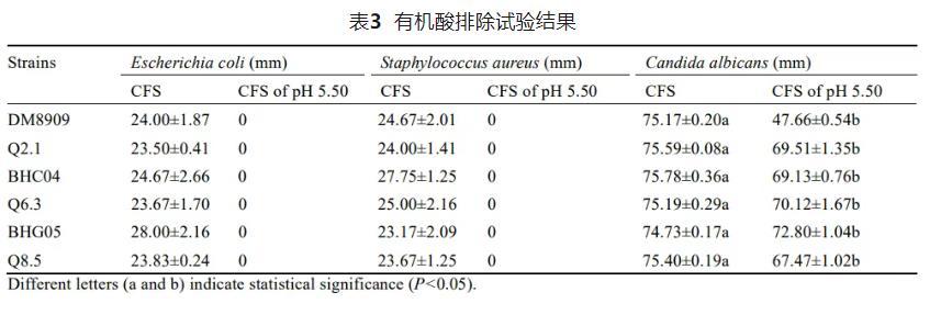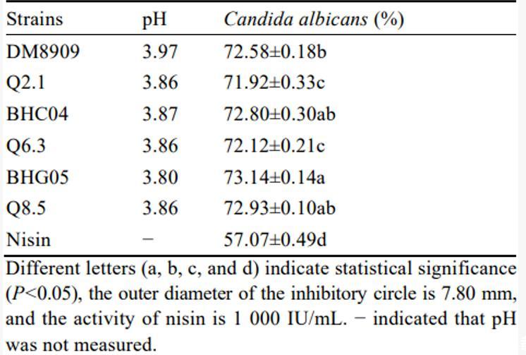 由表3可知,调节CFS的pH为5.50之后,CFS对大肠杆菌和金黄色葡萄球菌的抑制能力消失,可推测6株乳酸菌主要通过产生有机酸发挥抑菌能力。然而也有研究表明抑菌类物质在酸性条件下发挥抑菌作用,可能调节pH破坏了抑菌成分。CFS对白色念珠菌的抑菌能力见表3,对照菌株DM8909的抑制效果经酸排除后显著下降,说明对照菌株的抑菌效果大部分来自有机酸。5株乳酸菌CFS酸排除后抑菌效果均有下降,但抑制率仍保持在60.00%以上,菌株Q6.3和BHG05的CFS在pH 5.50时对白色念珠菌的抑菌率可达(70.12±1.67)%和(72.80±1.04)%,表明这5株乳酸菌可能分泌除有机酸以外的其他抑菌物质。