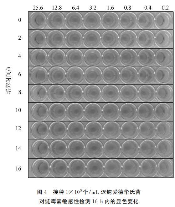 1x105个/mL和1x106个/mL接种菌液在不同质量浓度链霉素条件下,阿尔玛蓝指示剂颜色随着时间延长呈现连续差异变化。其中,接种1x106个/mL菌液的药物阴性对照孔在8h后颜色由蓝色变为粉色,此时药物质量浓度≤3.2μg/mL的测试孔均变为粉色,其他测试孔变为紫色(图3);接种1x105个/mL菌液的药物阴性对照孔在12h后变为粉色,此时药物质量浓度≤1.6μg/mL的测试孔均变为粉色,其他测试孔均保持蓝色不变,且在此后4h时间孔内颜色未再发生变化(图4)。