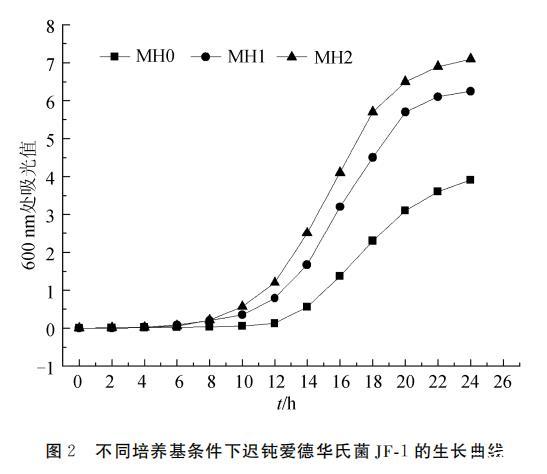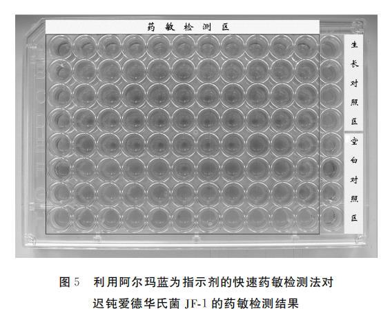 将菌株JF-1接种于MH2培养基中进行快速增殖,待菌液浊度达到0.5个麦氏比浊度时,用MHO稀释为1x105个/mL,加入药敏检测微孔板的药敏检测区及生长对照区,每孔80μL。在空白对照区内每孔滴加80μL M H0培养液,在所有微孔内分别加人10μL阿尔玛蓝指示剂,置于28℃培养箱中静置避光培养8~14h。待生长对照区由蓝色变为粉色时,取出药敏检测微孔板,肉眼观察记录各微孔内的颜色变化情况。每列中与粉红色微孔相邻的蓝色(或蓝紫色)孔所对应的药敏包被浓度即为该药物对菌株JF-1的最小抑菌质量浓度。