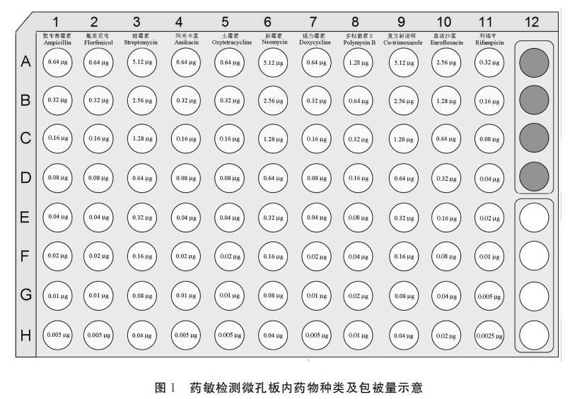 依据水产常用药物种类和禁用药物目录,选择氨苄青霉素、氟苯尼考、链霉素、阿米卡星、土霉素、新霉素、强力霉素、多粘菌素B、复方新诺明、恩诺沙星、利福平制备药敏检测板。根据不同药物的特性分别采用不同的溶剂准确配制成初始质量浓度为6.4、6.4、5.12、6.4、6.4、5.12、6.4、1.28、5.12、2.56、3.2mg/mL的抗菌药物储液,经0.22μm滤膜过滤后,并依次加入药敏检测区(A1~H11)内,每孔加入10μL,最终药敏检测板包被的抗菌药物见图1。在生长对照区(A12~D12)和空白对照区(E12~H12)内每孔加入10μL无菌超纯水作为对照。