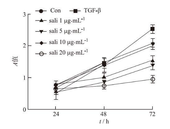 与Con组比较,TGF-β1组细胞增殖能力显著上升(t=207.277,P<0.05)。与TGF-β1组比较,sali 1 μg·mL-1、sali 5 μg·mL-1组、sali 10 μg·mL-1组和sali 20 μg·mL-1组的细胞增殖力均显著降低(F=1665.398,P<0.05)。见图1。