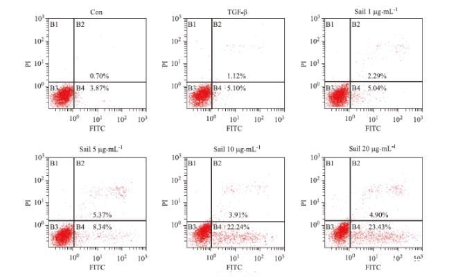 与Con组[(4.58±0.27)%]比较,与TGF-β1组[(6.21±1.61)%]的凋亡率上升,但差异无统计学意义(t=1.741,P>0.05)。与TGF-β1组比较,sali 1 μg·mL-1组[(7.33±1.11)%]凋亡率差异无统计学意义(t=0.987,P>0.05);sali 5 μg·mL-1组[(13.71±1.66)%],sali 10 μg·mL-1组[(26.15±0.83)%]和sali 20 μg·mL-1组[(28.33±1.11)%]的细胞凋亡率均显著升高(F=180.969,P<0.05),且在一定范围内,凋亡率随着药物剂量的增加而增加。sali 10 μg·mL-1组和sali 20 μg·mL-1组细胞凋亡率均显著高于sali 5 μg·mL-1组和sali 1 μg·mL-1组。见图2。