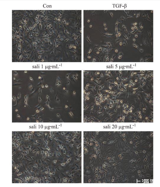 Con组细胞形态多成椭圆形或者圆形,而经过TGF-β1处理后,大部分细胞形态都明显拉长,细胞呈梭形,相邻细胞间连接也变得疏松。sali 1 μg·mL-1组的细胞形态和TGF-β1组形态相似,而sali 5 μg·mL-1组,sali 10 μg·mL-1组和sali 20 μg·mL-1组的细胞形态均多半呈椭圆形,细胞之间连接紧密。见图3。