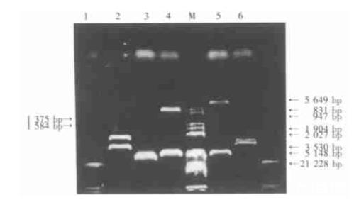 可疑重组子经EcoRⅠ酶切后能释放出860 bp的目的片段,为阳性重组子。再进一步用XhoⅠ和BamHⅠ分别酶切,根据酶切图谱切下的不同的片段可鉴定出AROM cDNA的插入方向如图1所示。正向重组子经XhoⅠ切成700 bp和5.63 kb两片段,经BamHⅠ切成3.0 kb和3.3 kb两片段。而反义重组子经XhoⅠ切成1.6 kb和6.18 kb两片段;经BamHⅠ切成3.9 kb和2.4 kb两片段。将所获得的反义重组子命名为PCI/as-AROM。