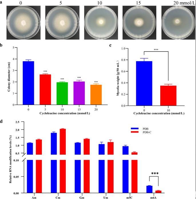 图1. 环亮氨酸抑制广叶绣球菌菌丝生长和m6A甲基化水平