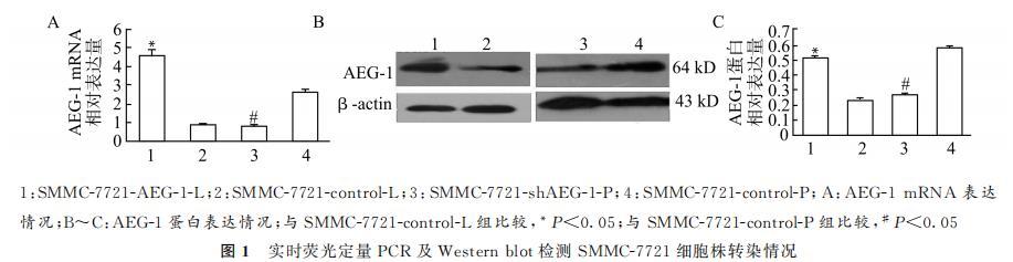 应用实时定量PCR检测SMMC-7721肝癌细胞株AEG-1 mRNA表达情况,结果显示:SMMC-7721-AEG-1-L、SMMC-7721-control-L肝癌细胞株AEG-1 mRNA表达量分别为[(4.58±0.32)vs.(0.86±0.05),P<0.05];SMMC-7721-shAEG-1-P、SMMC-7721-control-P肝癌细胞株 AEG-1 mR-NA表达量分别为[(0.80±0.07)vs.(2.61±0.13),P<0.05]。不同组别肝癌细胞AEG-1 mR-NA表达情况见图1A。