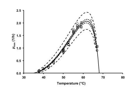 图1、温度对嗜热脂肪地芽孢杆菌ATCC 7953在胰蛋白胨大豆肉汤中的最大比生长速率(μmax)的影响,符合带有拐点的基数模型(实线)(等式(1))。点(○)表示μmax的观测值。虚线和不连续线分别描绘了温度对最大比生长速率影响的95%置信度和预测限值。