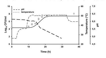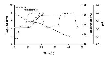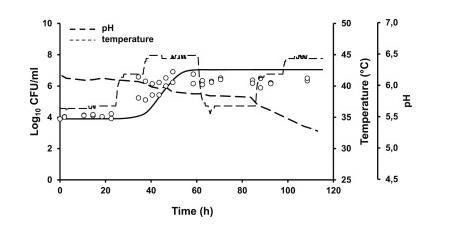 图5、在周期性变化的温度(37°C下24小时、42°C下12小时和45°C下24小时)下储存的淡奶中观察到的(点)和预测的(线)嗜热脂肪芽孢杆菌ATCC 7953生长的比较。不连续的线表示牛奶的pH值(---)和温度变化(------)。